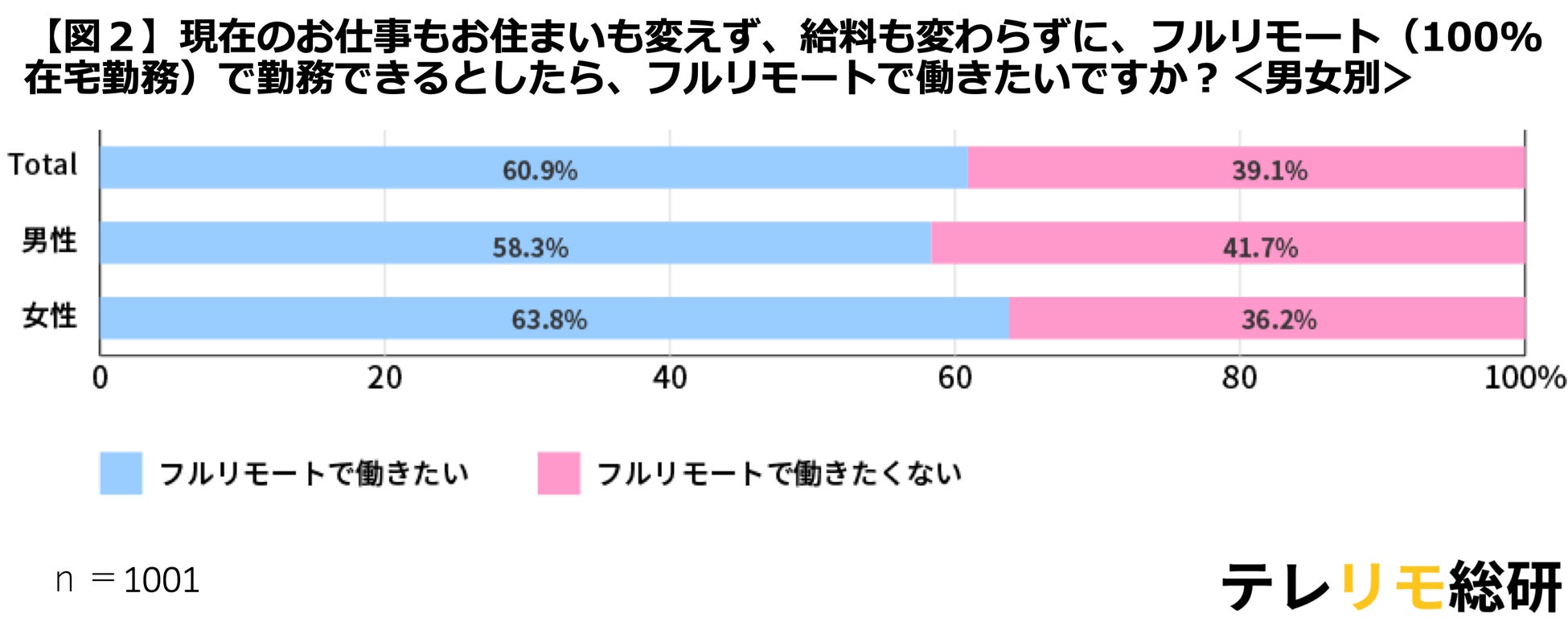 「フルリモート勤務を希望する」と回答した男性が58.3%なのに対し、女性は63.8%。
