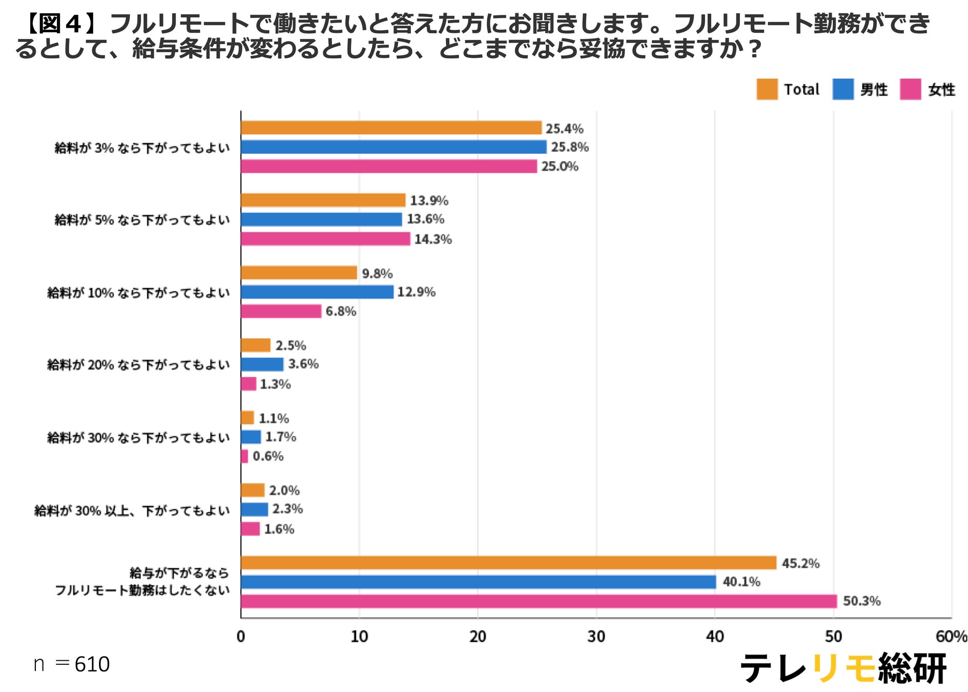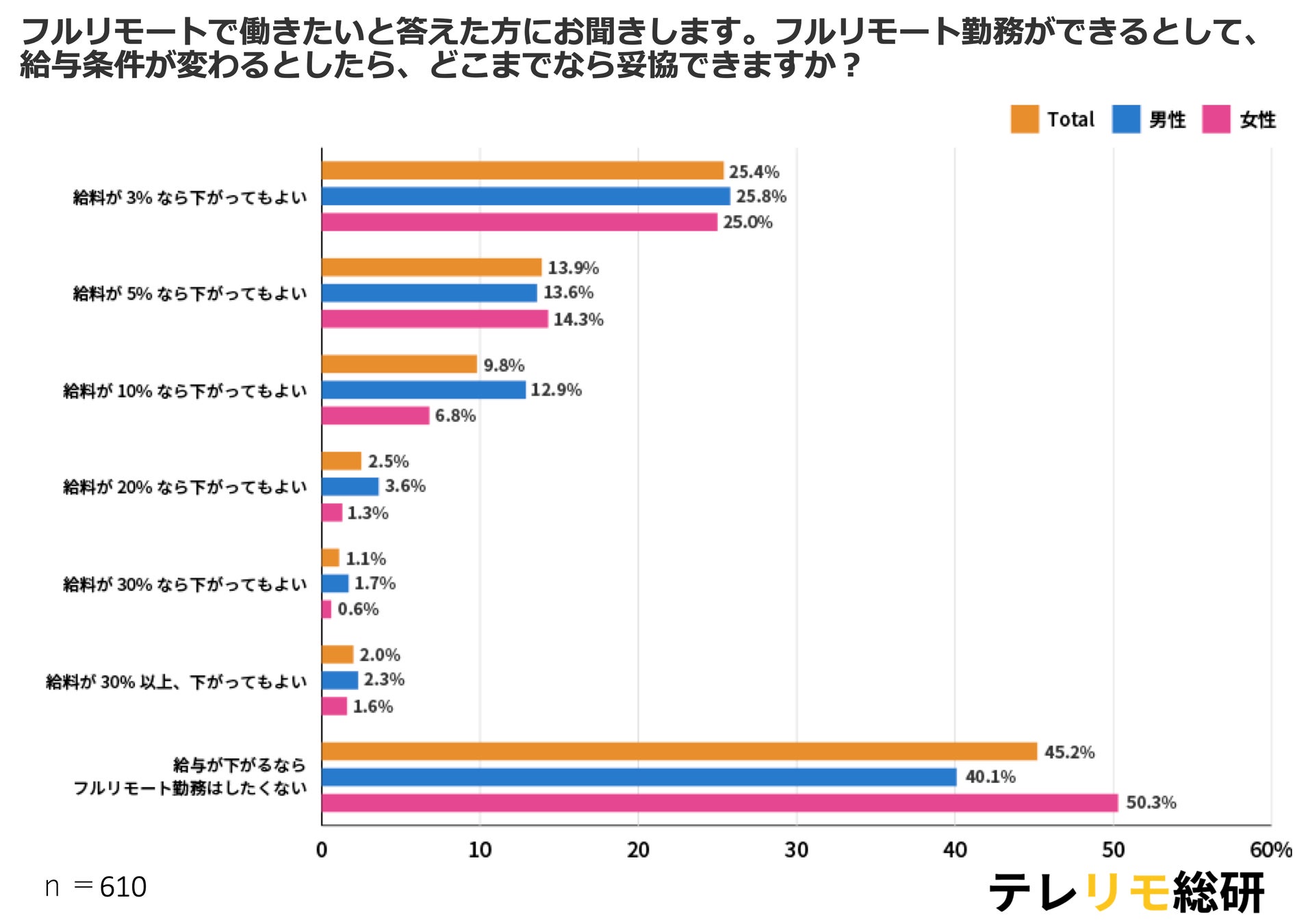 全体では54.8%の方が、給与が下がったとしてもフルリモートで働きたいと答えています。