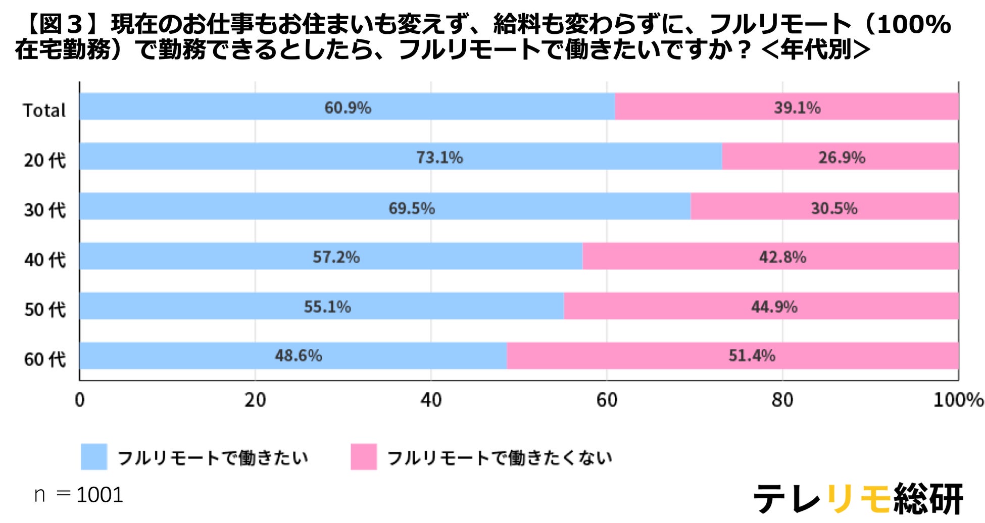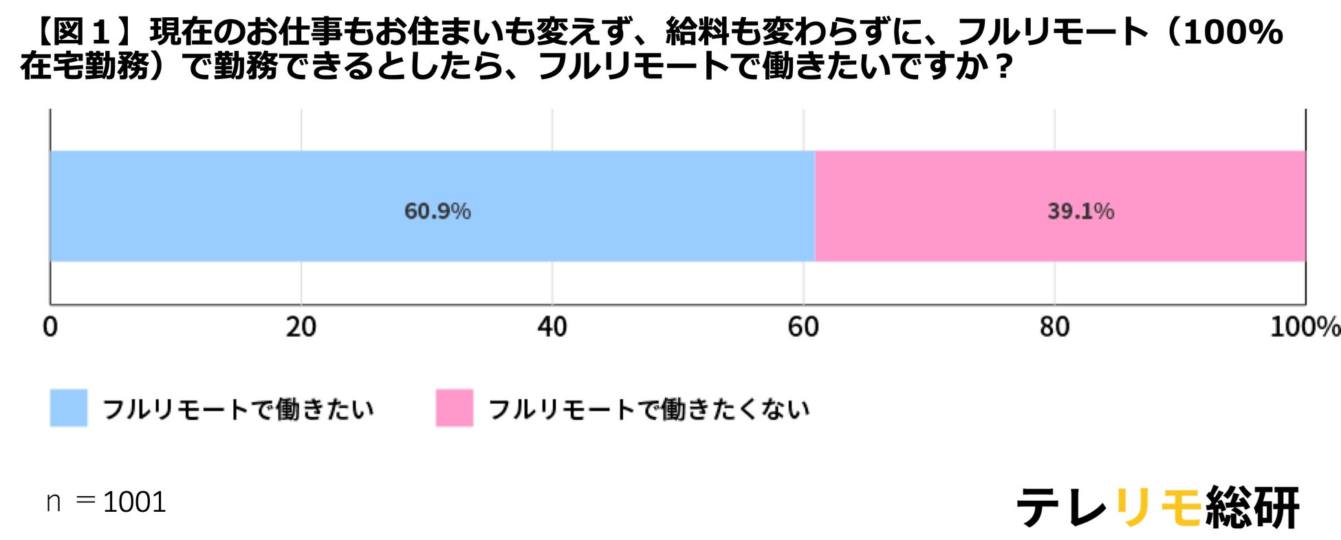 フルリモートを希望しないという方が39.1%だったのに対し、フルリモートで働きたいという方は60.9%と、全体の過半数を占めています。