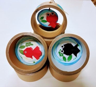 JR千葉駅で排出される「きっぷの芯」を使って、縁日でおなじみの金魚鉢や金魚袋に大変身。 フェイスシールドを活用したお面づくりも。 【主催】JR千葉駅×ペリエ千葉「ちばえきつながるプロジェクト」 【協力】NPO法人千葉大学環境ISO学生委員会 |