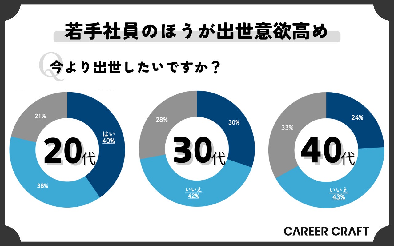 一方、「はい」(出世したい)と回答した割合に注目すると、20代が40%と最も大きい割合になりました。(30代は30%、40代は24%)