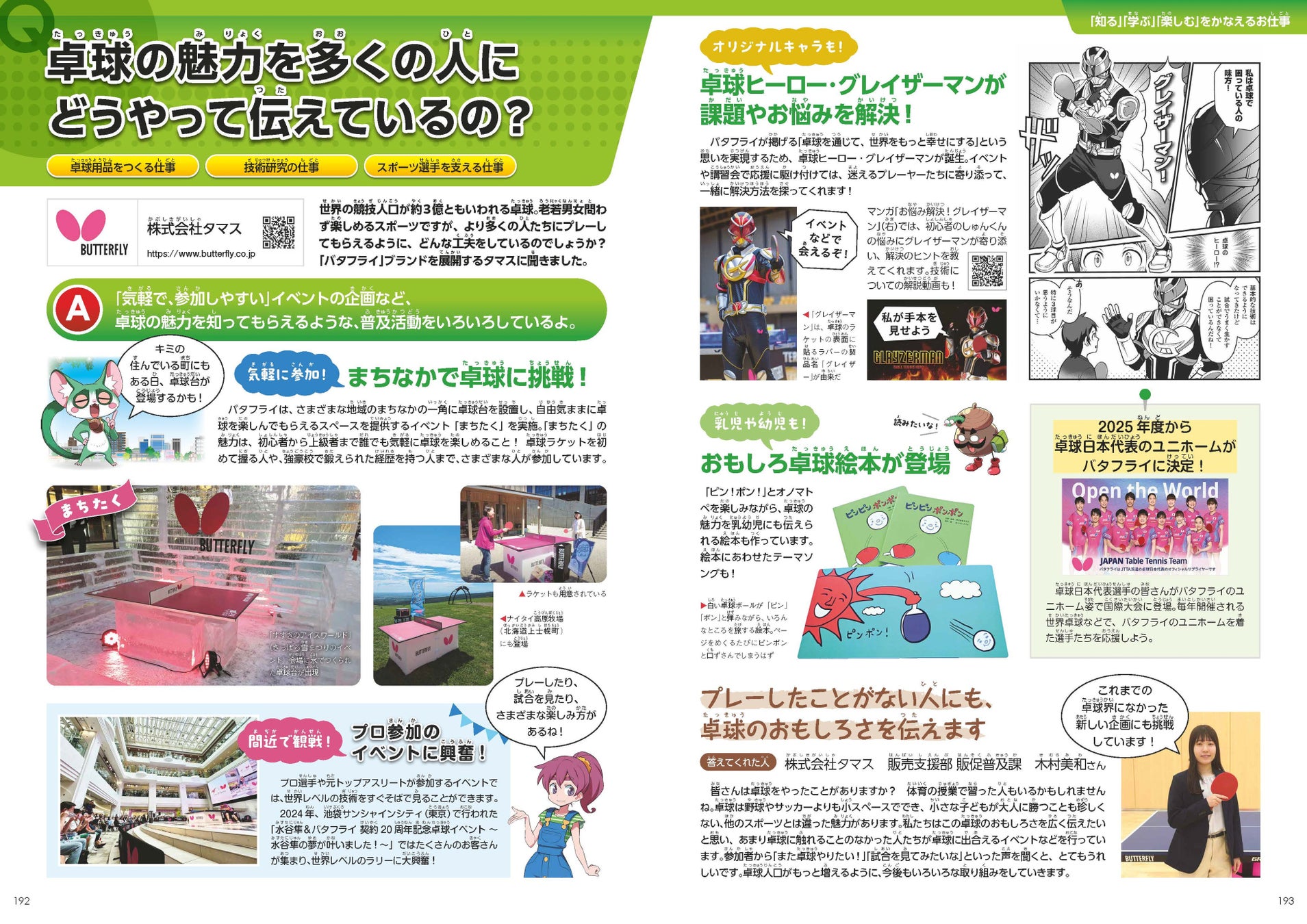 「おしごと年鑑」では、子どもにもわかりやすい視点から協賛企業の仕事内容が紹介されています。当社は2025年版で、「卓球を広める仕事」という視点で、卓球の普及活動にスポットライトを当てました。