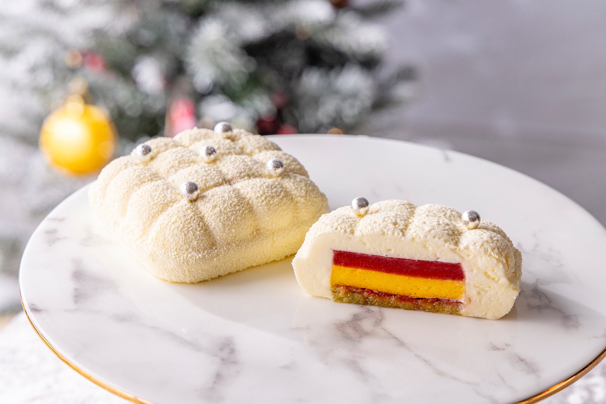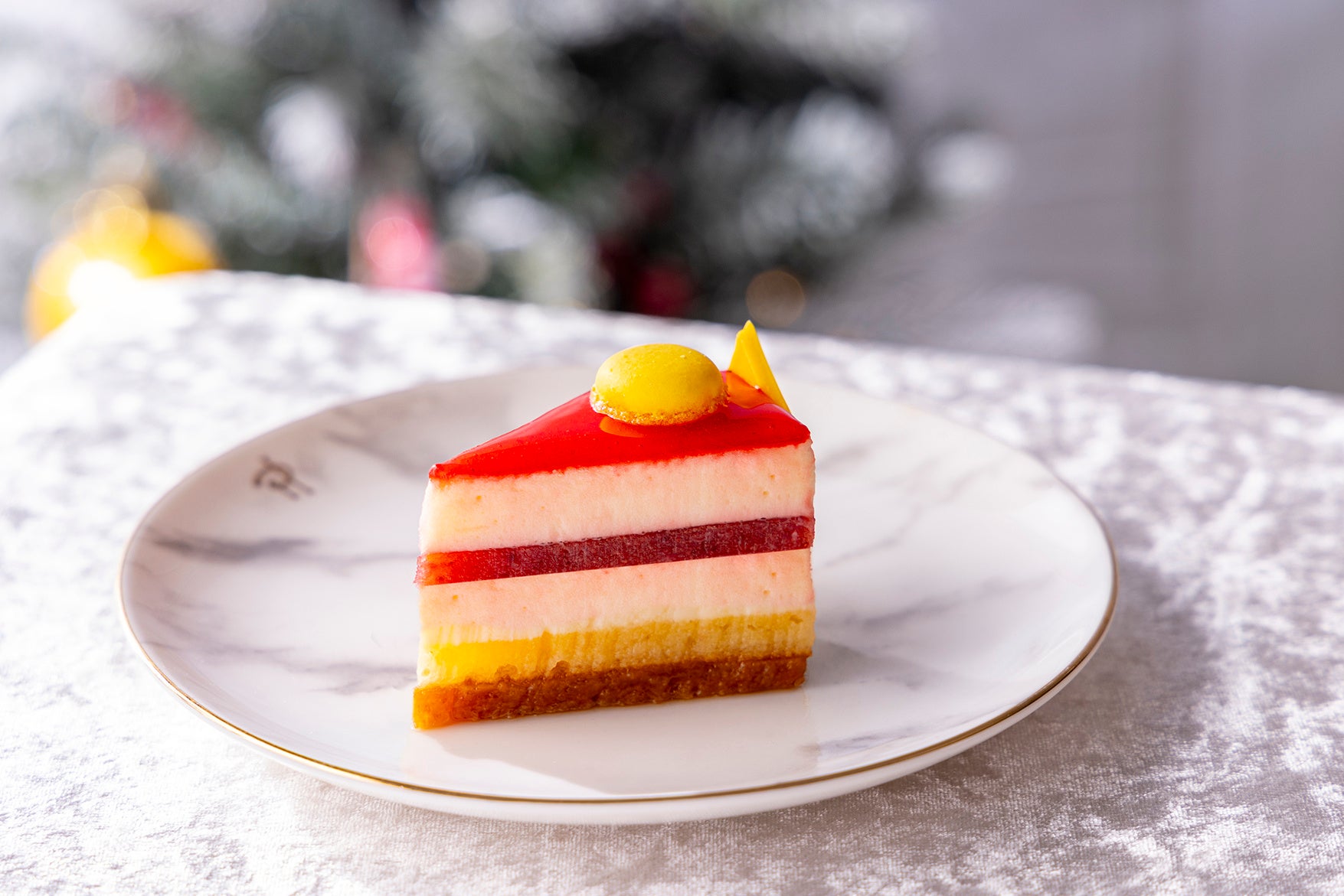 イチゴのジュレ、マンゴークリーム、ピスタチオのビスキュイをホワイトチョコレートのムースで優しく包んだケーキ。