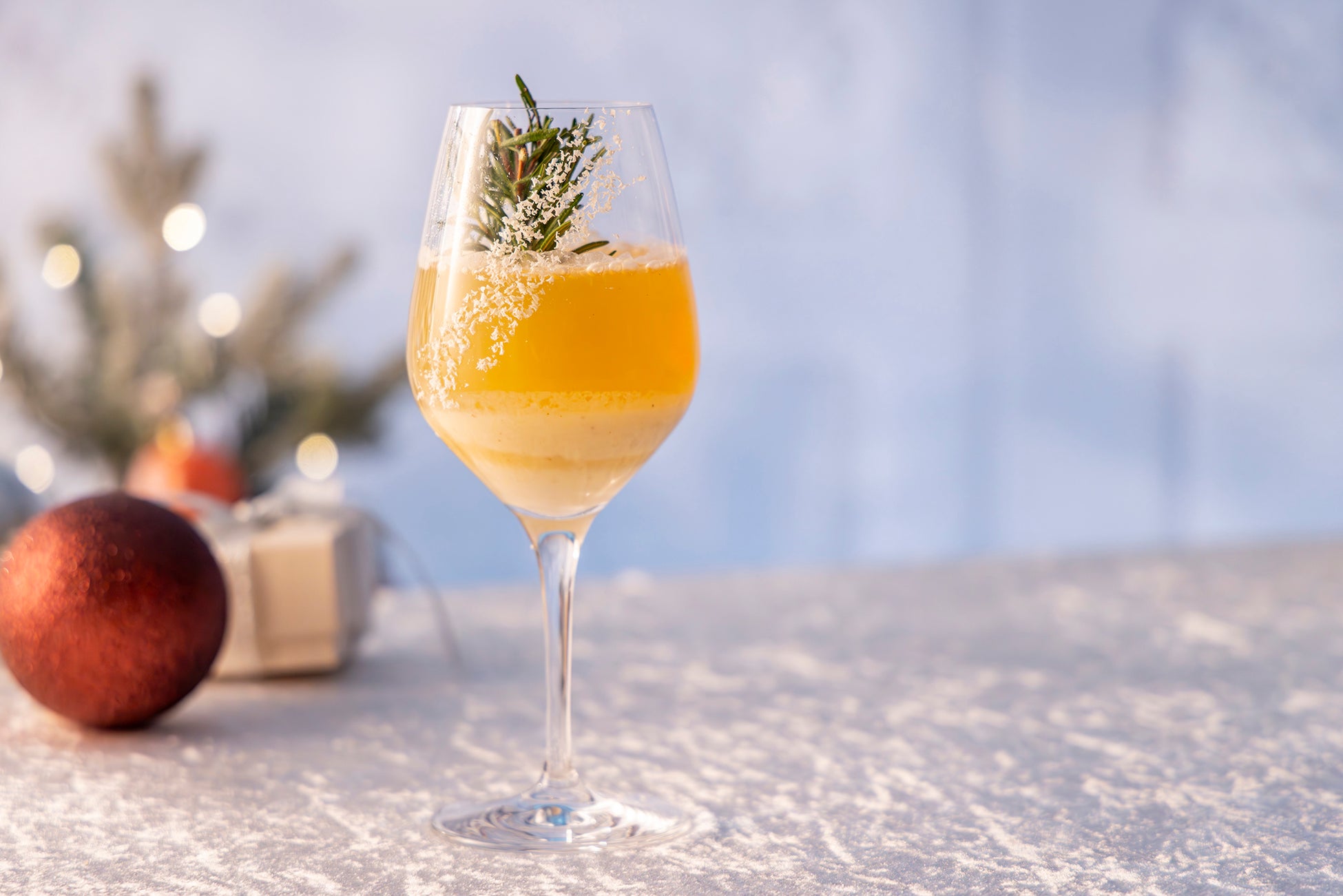 クリスマスツリーに見立てたローズマリーに雪が積もっていく景色をイメージ。洋梨のピューレとノンアルコールシャンパンの香り豊かなドリンク。