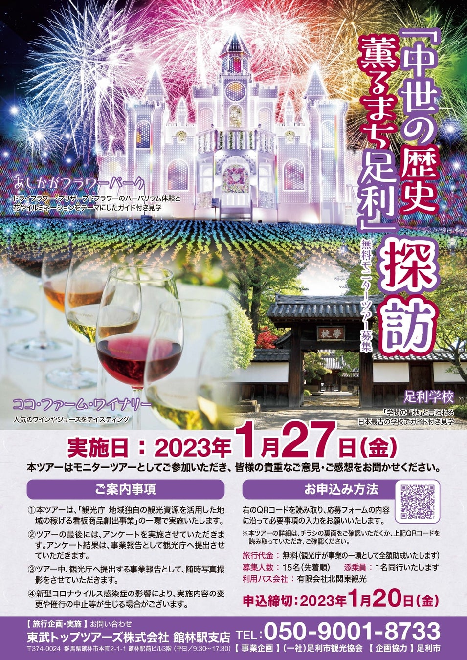 東武トップツアーズ株式会社(本社:東京都墨田区、社長:百木田康二)は、一般社団法人足利市観光協会、足利市協力のもと、観光庁の「地域独自の観光資源を活用した地域の稼げる看板商品の創出事業」として、1月27日(金)に栃木県足利市で開催される「中世の歴史薫るまち足利」を探訪するモニターツアー参加者を募集しますので、お知らせいたします。