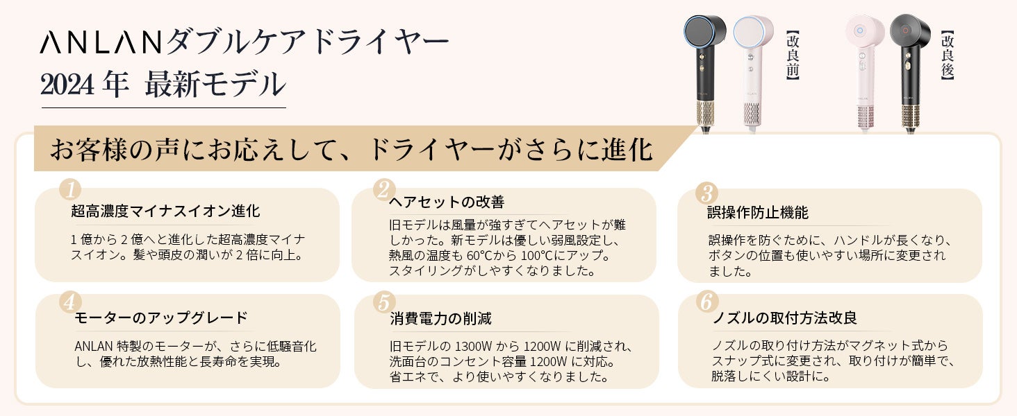 お客様から寄せられた声をもとに、より使いやすく、髪と頭皮に優しいドライヤーへと進化しました。今回の改良により、毎日のヘアケアがより快適になります。