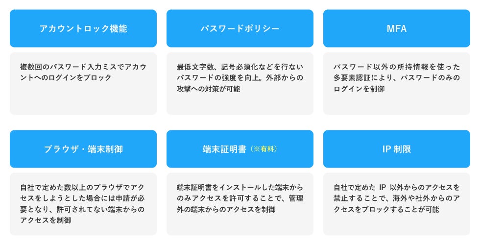 メタップスクラウドは、アクセス制限以外にもシングルサインオンや多要素認証を含むあらゆるセキュリティを搭載しております。今後も時代の変化とともに必要となる機能をいち早く取り入れ、提供してまいります。