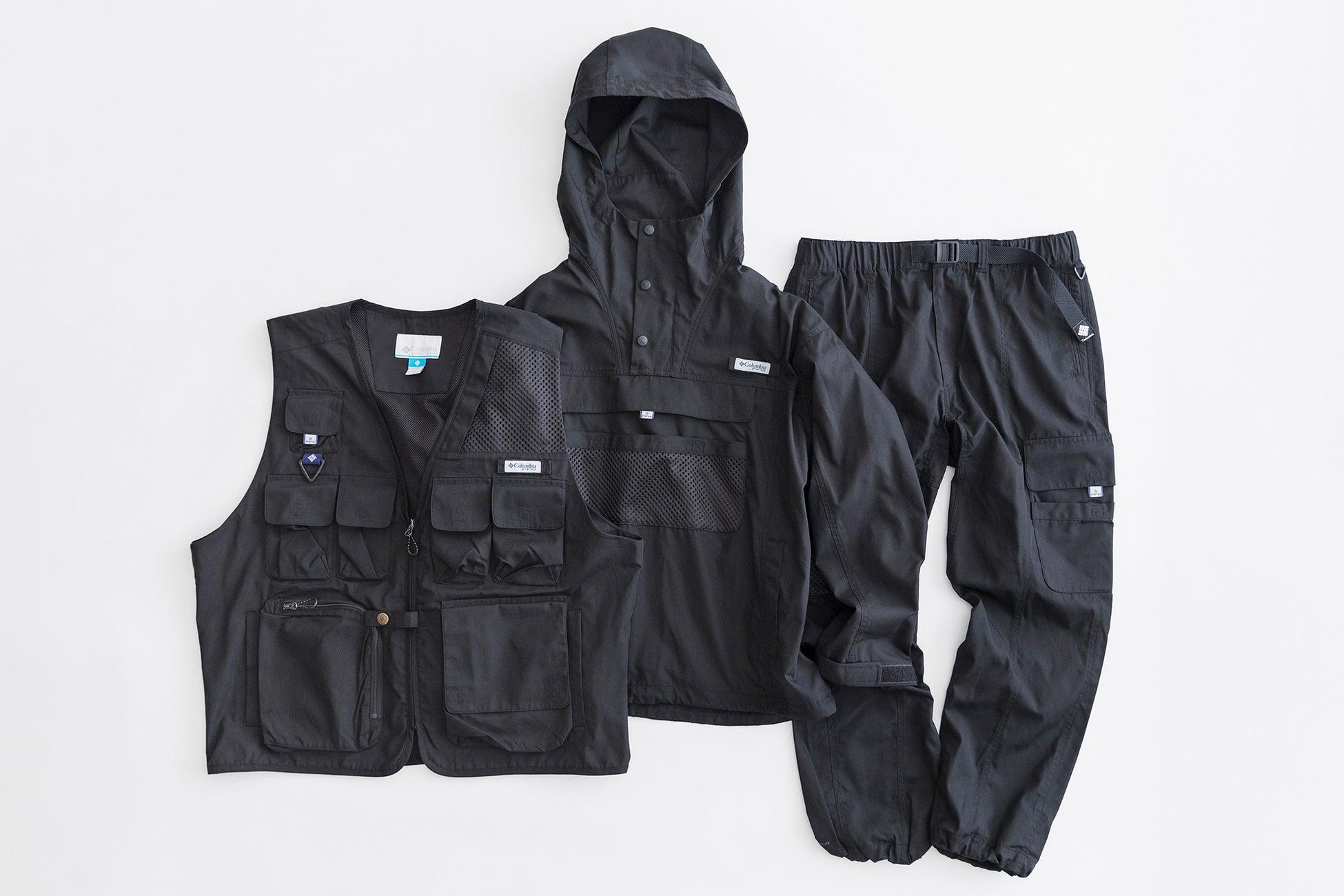 ラインナップはフィッシングベスト、アノラックパーカ、パンツ、ハット、ショルダーバッグの5アイテム。90年代のコロンビアPFGアイテムに見られるメッシュポケットをデザインの軸に現代的なアップデートを加え、セットで組み合わせも、単体としても存在感を放つアイテムに仕上がっています。