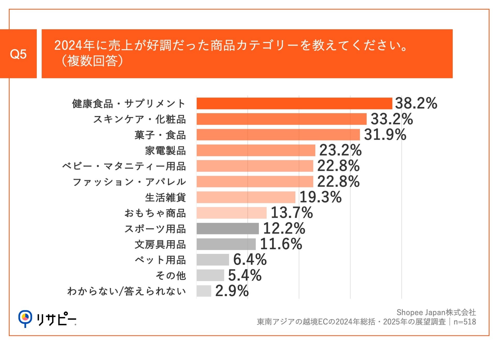 「Q5.2024年に売上が好調だった商品カテゴリーを教えてください。(複数回答)」(n=518)と質問したところ、「健康食品・サプリメント」が38.2%、「スキンケア・化粧品」が33.2%、「菓子・食品」が31.9%という回答となりました。