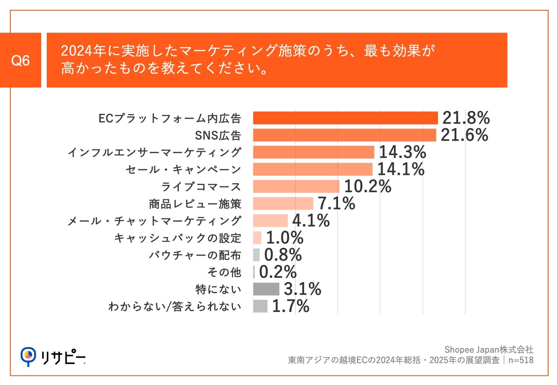 「Q6.2024年に実施したマーケティング施策のうち、最も効果が高かったものを教えてください。」(n=518)と質問したところ、「ECプラットフォーム内広告」が21.8%、「SNS広告」が21.6%、「インフルエンサーマーケティング」が14.3%という回答となりました。