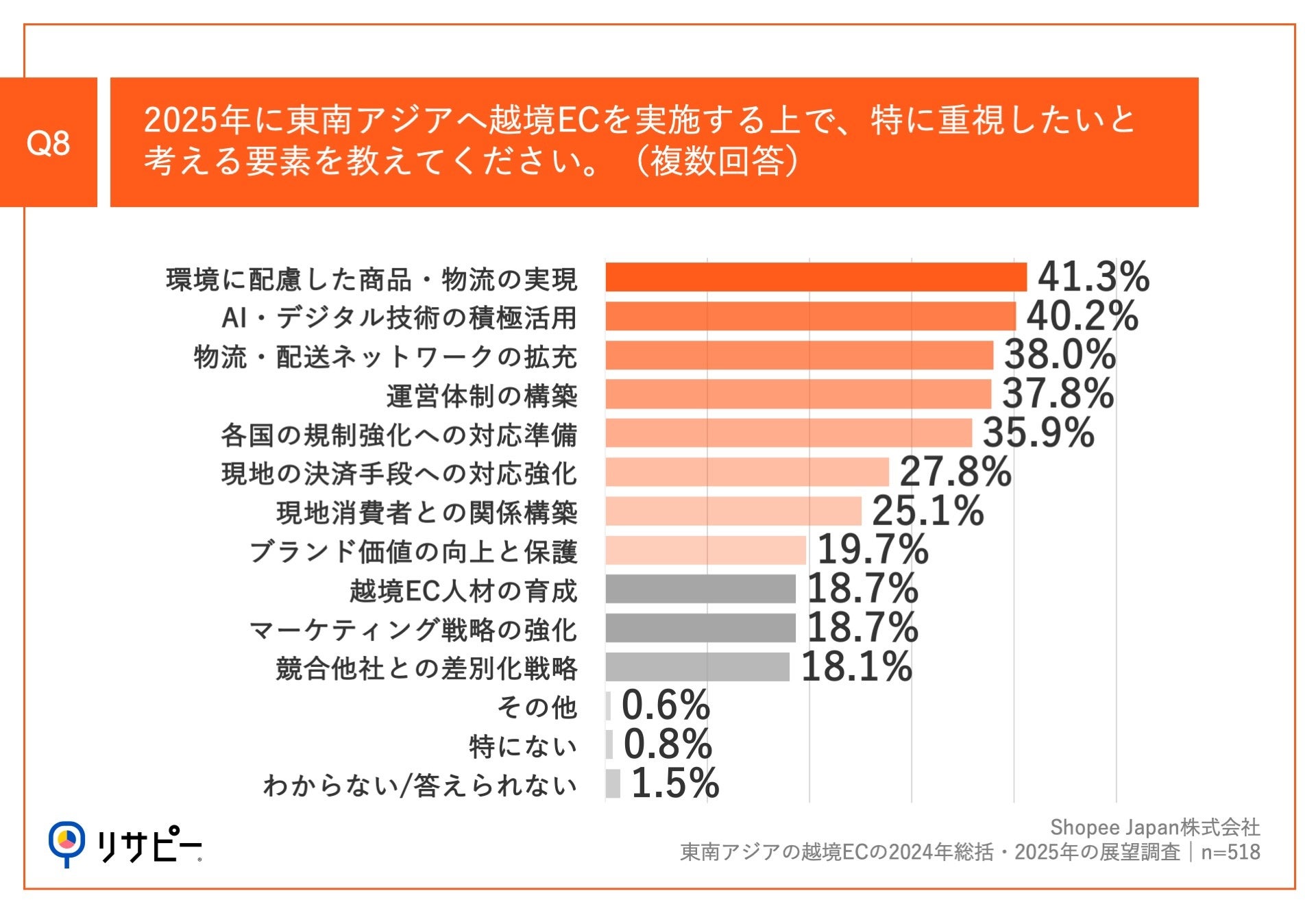 「Q8.2025年に東南アジアへ越境ECを実施する上で、特に重視したいと考える要素を教えてください。(複数回答)」(n=518)と質問したところ、「環境に配慮した商品・物流の実現」が41.3%、「AI・デジタル技術の積極活用」が40.2%、「物流・配送ネットワークの拡充」が38.0%という回答となりました。