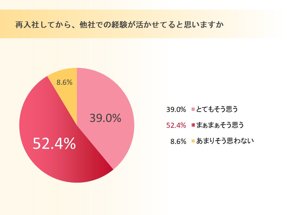 再入社してから、他社での経験が活かせていると思うか尋ねたところ、「とてもそう思う」の回答が39%、「まぁまぁそう思う」の回答が52.4%と、約9割の人が「そう思う」と回答しました。