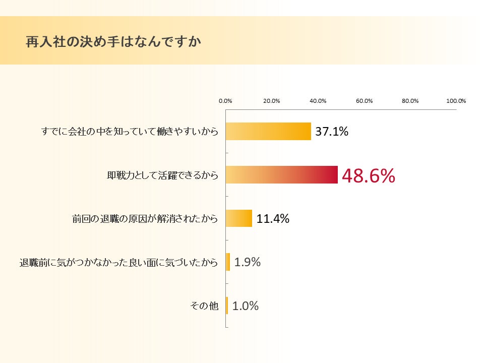 再入社の決め手となったことを尋ねると、最も多かったのは「即戦力として活躍できるから」で48.6%、続いて「すでに会社の中を知っていて働きやすいから」が37.1%でした。