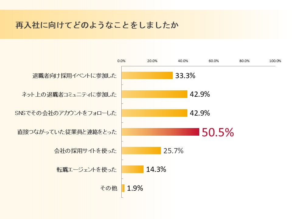 再入社に向けてどのようなことをしたか尋ねたところ、「直接つながっていた従業員と連絡をとった」が50.5%と最も多く、続いて「ネット上の退職者コミュニティに参加した」「SNSでその会社のアカウントをフォローした」がどちらも42.9%、「退職者向け採用イベントに参加した」が33.3%でした。