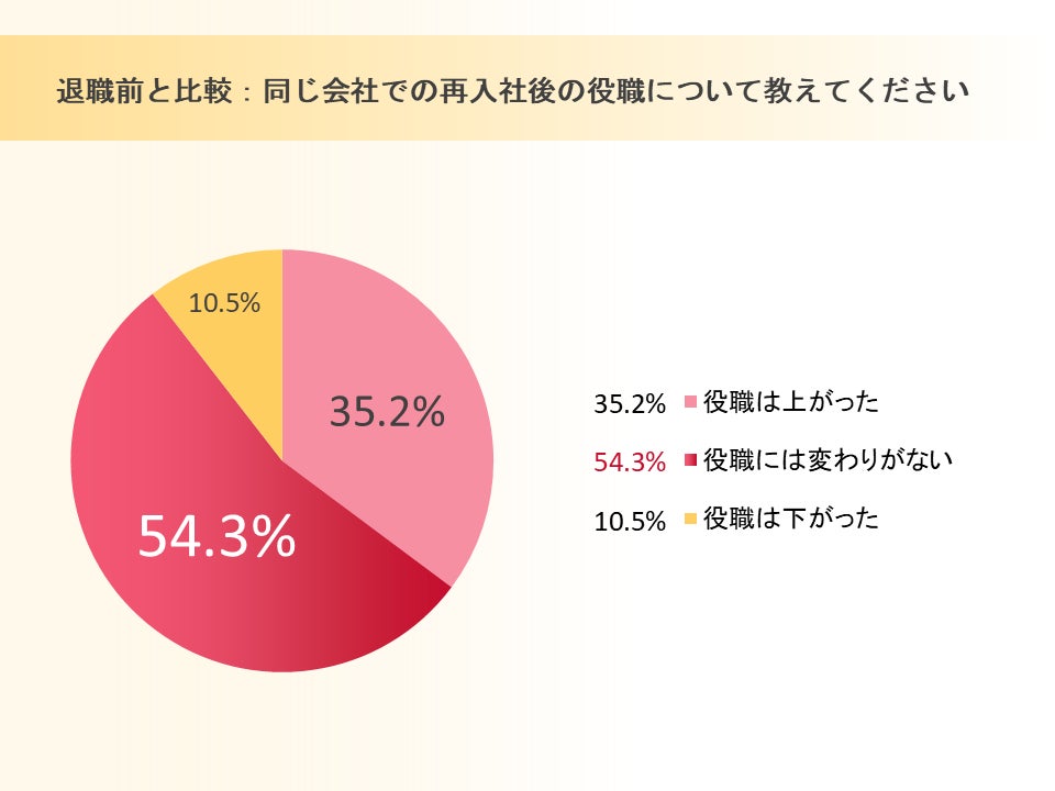役職については、「役職は上がった」との回答は35.2%、「役職には変わりがない」が54.3%でした。