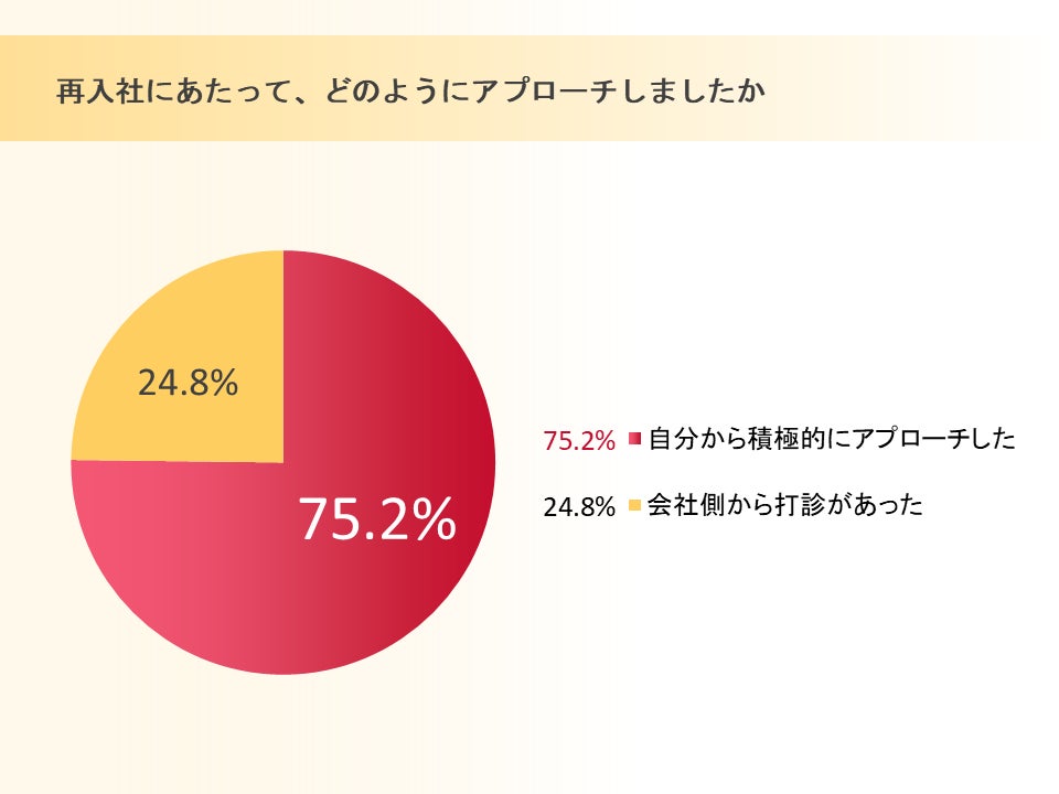 再入社を進めるにあたり、自分からアプローチしたか、会社から声がかかったか尋ねたところ、自分から積極的にアプローチしたとの回答が75.2%、会社側から打診があったとの回答が24.8%と、自分から再入社に向けて動いた割合が高いことがわかりました。