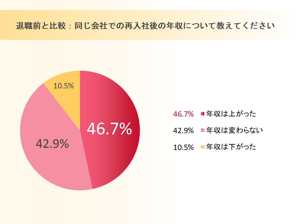 退職前と比較して、同じ会社での再入社後の年収について尋ねると、最も多かったのは「年収は上がった」で46.7%、「年収は変わらない」は42.9%でした。