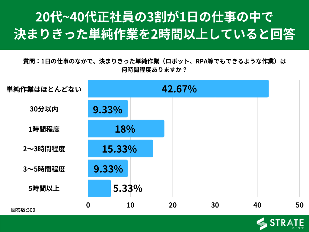 20代〜40代の男女を対象とした「1日の仕事のなかで、決まりきった単純作業(ロボット、RPA等でもできるような作業)は何時間程度ありますか?」というアンケートで最も多かった回答は「単純作業はほとんどない」で42.67%でした。