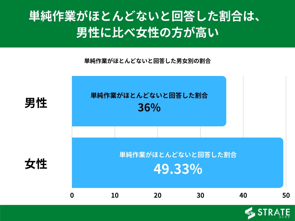 単純作業がほとんどないと回答した割合を男女別でみてみますと、女性が49.33%に対し、男性は36%にとどまりました。
