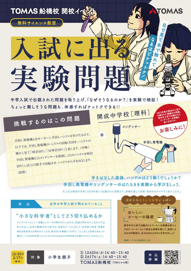 難関中学入試で出題された問題を実験で検証する人気イベント!難関中学入試で求められる科学的関心・思考・態度を、体感を通して楽しく学ぶ育むイベントです。受験生以外のお子さんもぜひご参加ください。