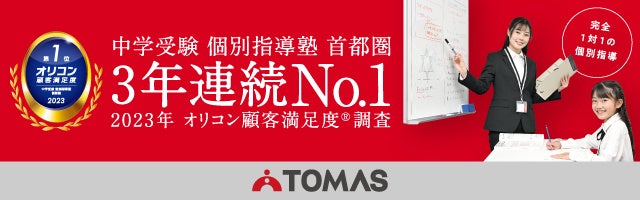 進学個別指導塾「TOMAS」が2023年 オリコン顧客満足度®調査の中学受験 個別指導塾 首都圏ランキング(以下「本ランキング」)において全8つの項目※で評価された結果、総合1位を獲得いたしました。本ランキングにおいて総合1位を獲得するのは2021年以降3年連続となります。引き続き皆様に満足していただける“本物の教育サービス”を提供できるよう全力で努めてまいります。