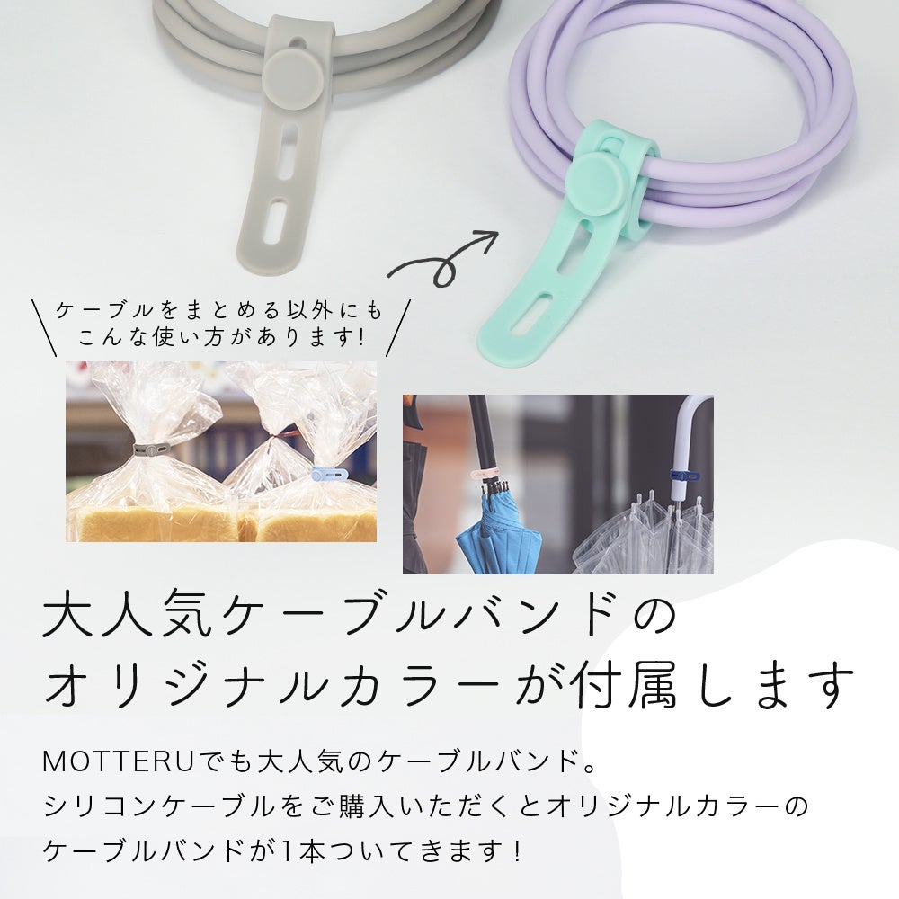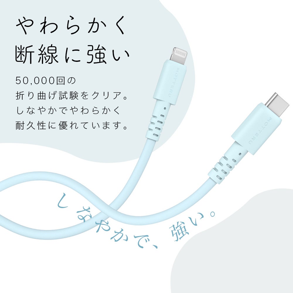 MOTTERUのシリコンケーブルは、まるで赤ちゃんの肌のようになめらかで、ずっと触っていたくなるような手触りです。MOTTERUらしい優しくかわいらしいカラーリングは、今までのケーブルになかったカラーコーディネートを楽しむことができます。しなやかで断線に強く、50,000回の屈曲試験をクリアした耐久性も特徴です。