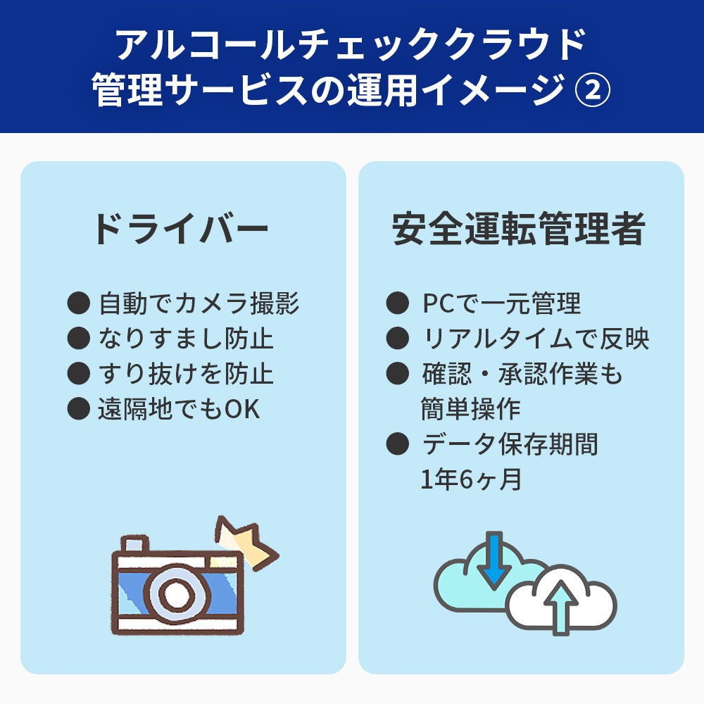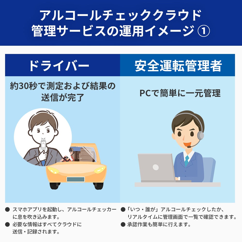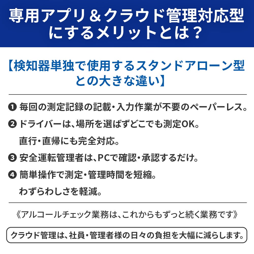 本体はボタン一つの操作で検査から履歴確認まで出来るシンプル設計。高精度で高耐久な電気化学式センサーを採用しています。クラウドでの記録管理に対応しているので、義務化されているアルコール検知器によるチェック業務での運転者、管理者の大幅な作業効率化が可能です。