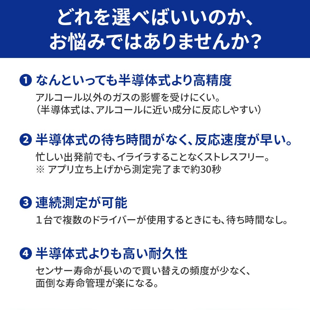 高精度 & 高耐久 & 低コストで使いやすい!本体重量45gの超軽量手のひらサイズ!カンタン操作のクラウド管理で業務効率化にも最適なアルコール検知器です。