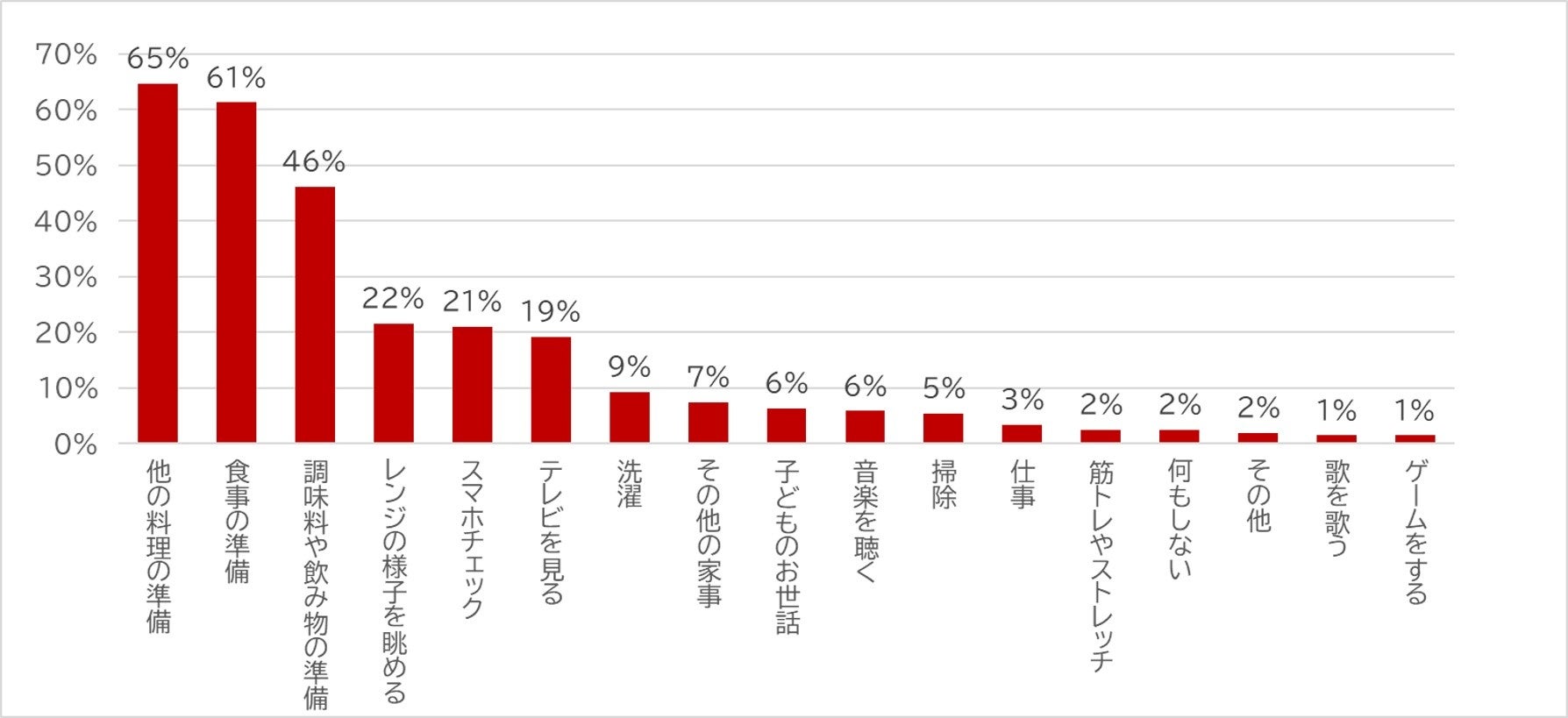 ファンに、レンジ調理中の待ち時間をどう過ごしているかを聞いたところ、「他の料理の準備」(65%)、「食事の準備」(61%)、「調味料や飲み物の準備」(46%)といった食事関連の作業が多く見られました。また、「洗濯」(9%)、「掃除」(5%)、「その他の家事」(7%)といった家事をこなす方も。