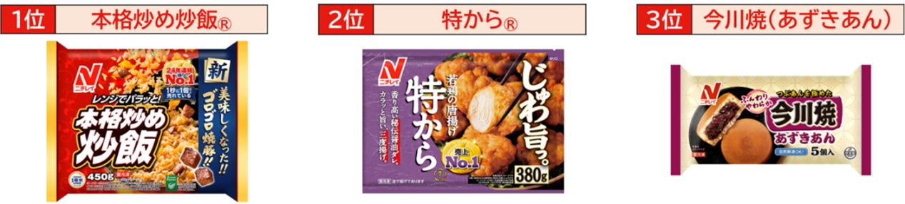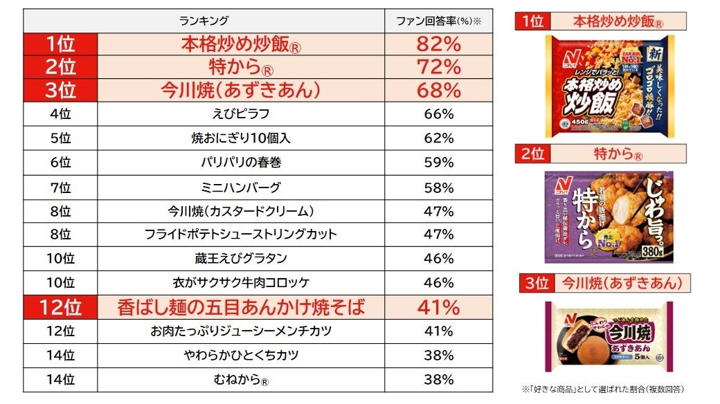 1.ニチレイの家庭用冷凍食品全124品の中で好きな商品1位は「本格炒め炒飯®」、2位「特から®」、3位「今川焼(あずきあん)」という結果に。また、2023年発売の「香ばし麺のあんかけ焼そば」が12位にランクイン。