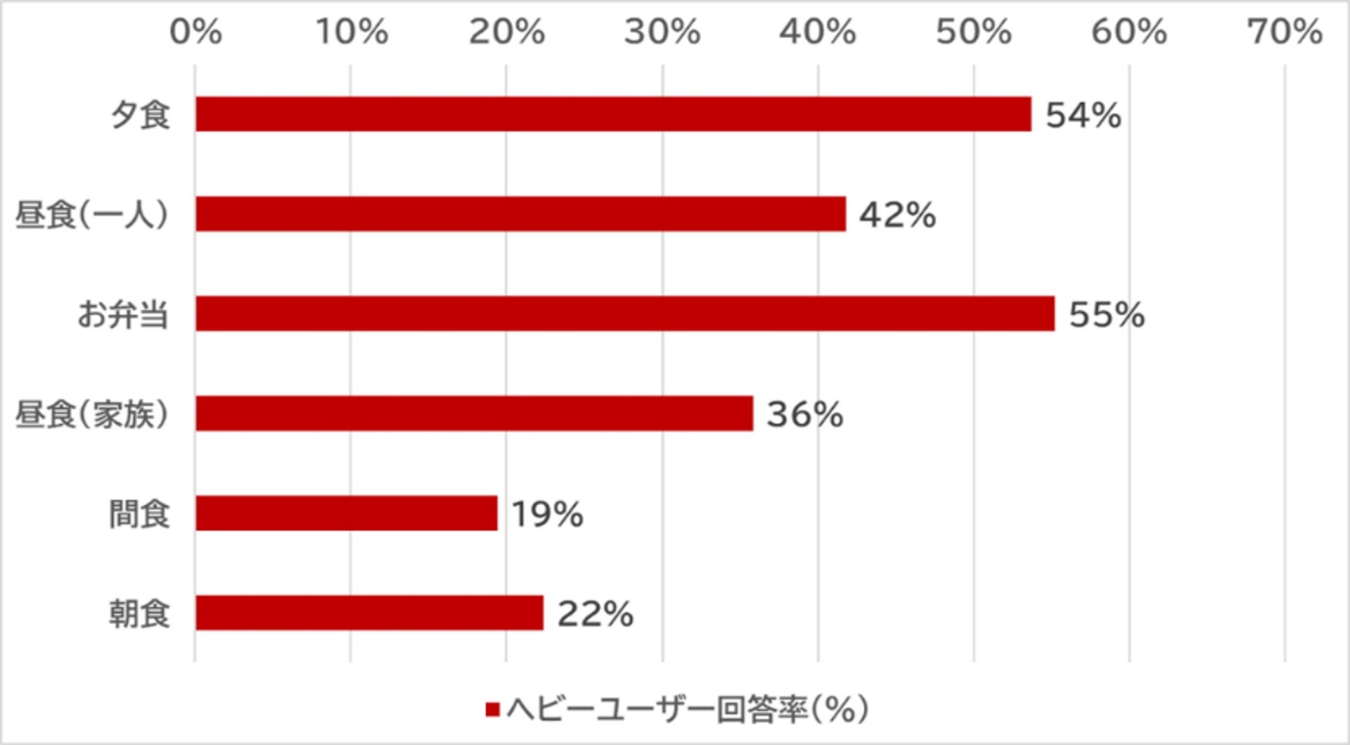 また、それらを食べるタイミングについて聞いたところ、ファン全体では2位に差をつけて「夕食」が最も高かったのに対してヘビーユーザーだけに絞ると「お弁当」(55%)、「夕食」(54%)という順に高い回答となり、ヘビーユーザーの半数以上がお弁当利用をしている実態が明らかになりました。