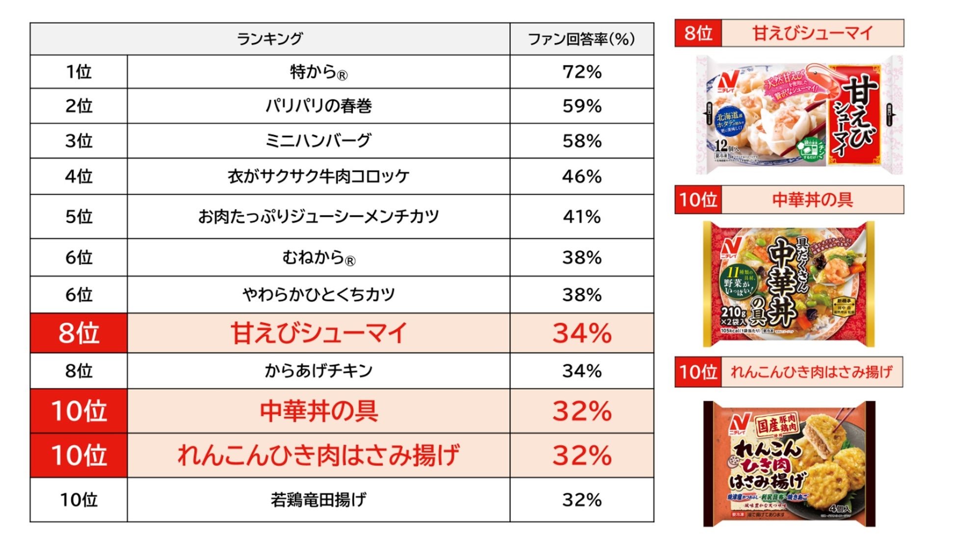 ファンが回答した「好きな商品(複数回答可)」でおかずのみに絞ったランキングでは、8位「甘えびシューマイ」(34%)、10位「中華丼の具」(32%)「れんこんひき肉はさみ揚げ」(32%)とファンだからこそ知るロングセラー商品が上位にランクインしました。