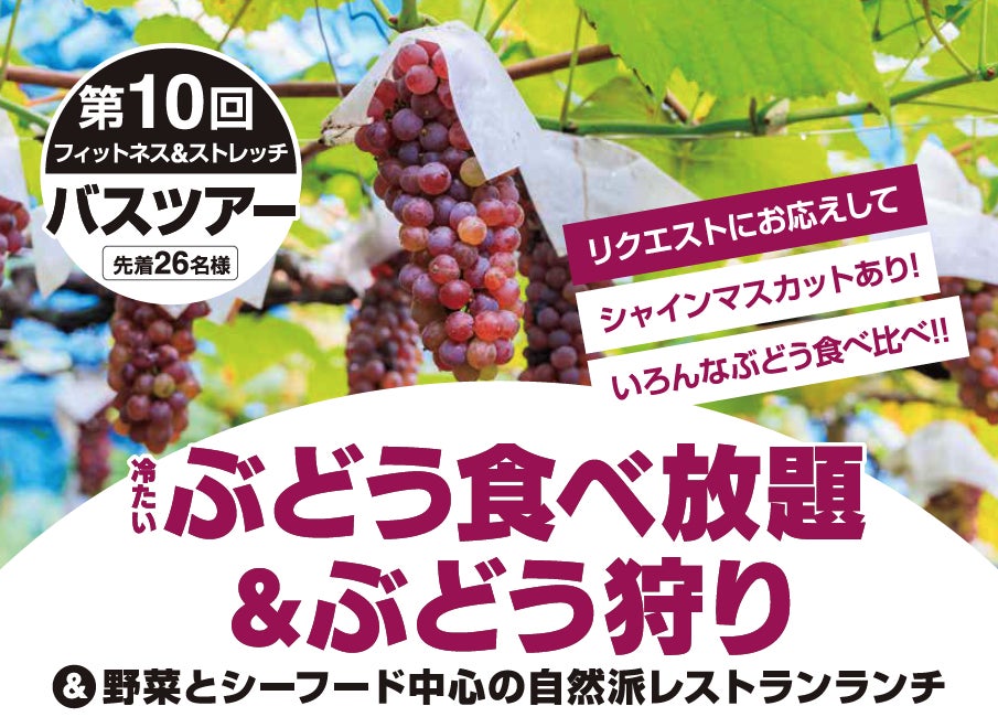 株式会社いーふらん(本社:神奈川県横浜市、代表取締役社長 鹿村大志、以下いーふらん)は、いーふらんが展開する「フィットネス&ストレッチ 健康の森」事業において、運動を通じた健康促進のみではなく、体験を通じたこころの充足、人と人とのつながりを「遊びながら」創出する会員限定バスツアーにおいて、9月は「冷たいぶどう食べ放題&ぶどう狩りツアー」の開催を実施することをお知らせいたします。