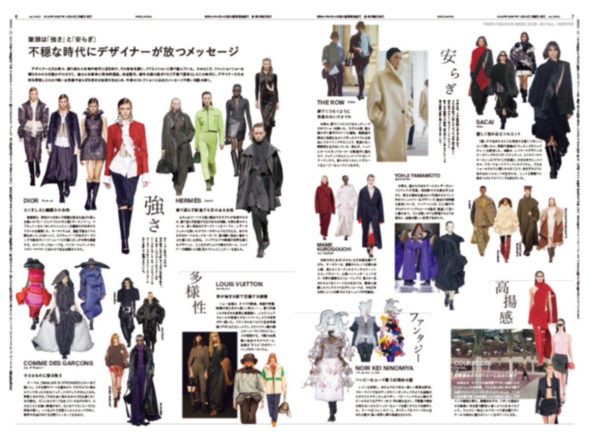 デザイナーの交代劇でトレンドは正直見えづらいシーズンでしたが、特集では、その中でも重要な潮流をいくつかピックアップしています。代表的なのは、不穏な時代だからこそデザイナーが放った「強さ」や「安らぎ」のメッセージ。「ディオール(DIOR)」ヤ「エルメス(HERMES)」「コム デ ギャルソン(COMME DES GARCONS)」などを中心に「強さ」を、「ザ・ロウ(THE ROW)」や「サカイ(SACAI)」「マメ クロゴウチ(MAME KUROGOUCHI)」などからは「安らぎ」のメッセージを紐解きます。さらにはビンテージの美学をうまく取り入れる「ヴァレンティノ(VALENTINO)」や「クロエ(CHLOE)」「ミュウミュウ(MIU MIU)」、ワーキングウーマンのスタイルをアップデートする「シャネル(CHANEL)」や「サンローラン(SAINT LAURENT)」「ステラ マッカートニー(STELLA McCARTNEY)」などにもフォーカスしています。