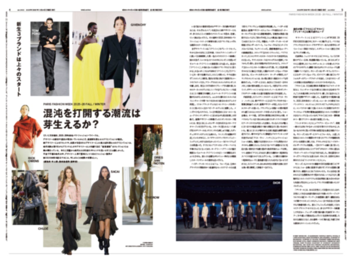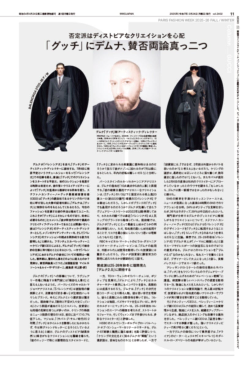 さらに特集では、「バレンシアガ(BALENCIAGA)」から「グッチ(GUCCI)」への電撃移籍が発表になったデムナ(Demna)について、専門家が分析しています。デムナの「グッチ」について、専門家の見解は賛成と反対に真っ二つ!反対派は皆、デムナのディストピア(暗黒世界)を思わせるクリエイションに懐疑的です。一方の賛成派は、そんなディストピアなクリエイションを「グッチ」で見せることはないだろうと分析。そんな気配を25-26年秋冬の「バレンシアガ」のコレクションから感じ取ったと主張します。どういうことでしょうか?ぜひ、紙面をご覧ください。