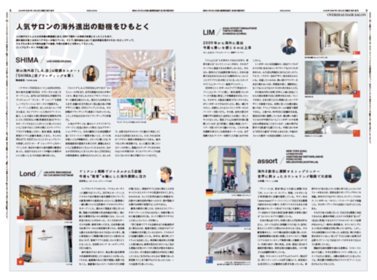 第2特集は「海外進出サロン特集」で、人気サロンの海外進出の動機をひもときます。人口減少などによる日本市場の閉塞感に加え、SNSで海外への発信が容易になったこともあり、海外進出を狙う日本のヘアサロンが増えています。そこで、海外進出において先んじている人気4サロン(「SHIMA(シマ)」「ロンド(Lond)」「リム(LIM)」「アソート(assort)」)をピックアップ。それぞれの考え方や海外店舗での集客、今後の計画などを明かしてもらいました。