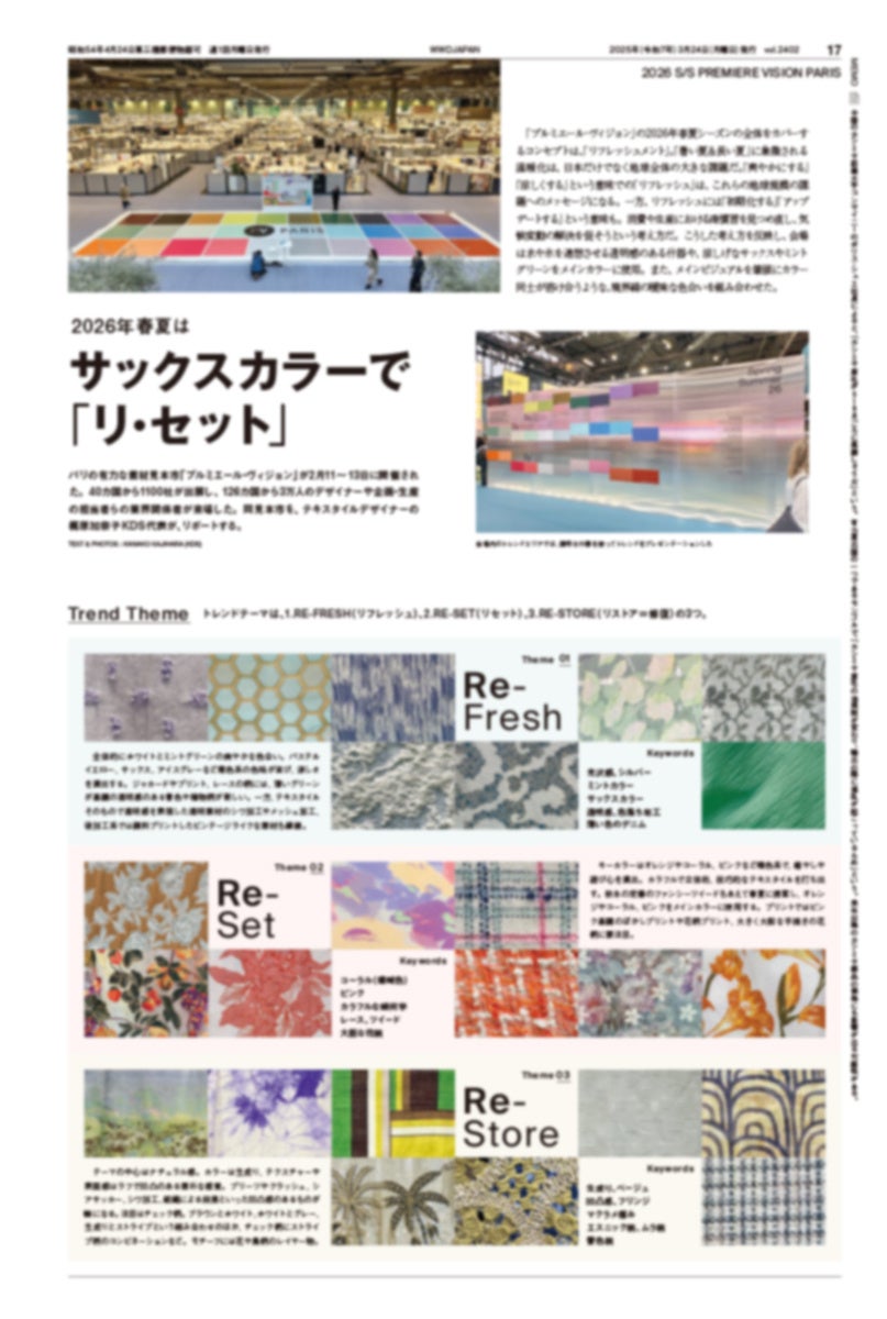 後半では、26年春夏のテキスタイルトレンドを紹介。パリの素材見本市「プルミエール・ヴィジョン」の傾向をテキスタイルデザイナーの梶原加奈子KDS代表に分析していただきました。ファッション&ビィーティパトロールでは、53歳の時にアパレル業界を卒業して漫画家に転身した林田もずるさんのインタビューを掲載。ファッション業界の舞台裏を描いた「アパレルドッグ」の誕生秘話とは?そして、林田さん流のファッション業界への恩返しとは?胸アツなインタビューをお楽しみに!