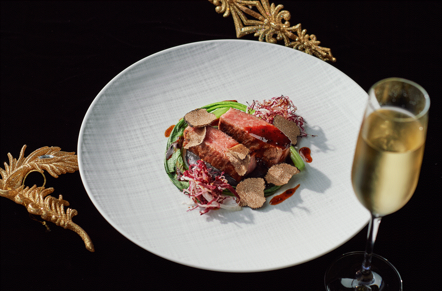 ・和牛サーロイン ラディキオサラダ 黒い根セロリピューレ 黒トリュフソース