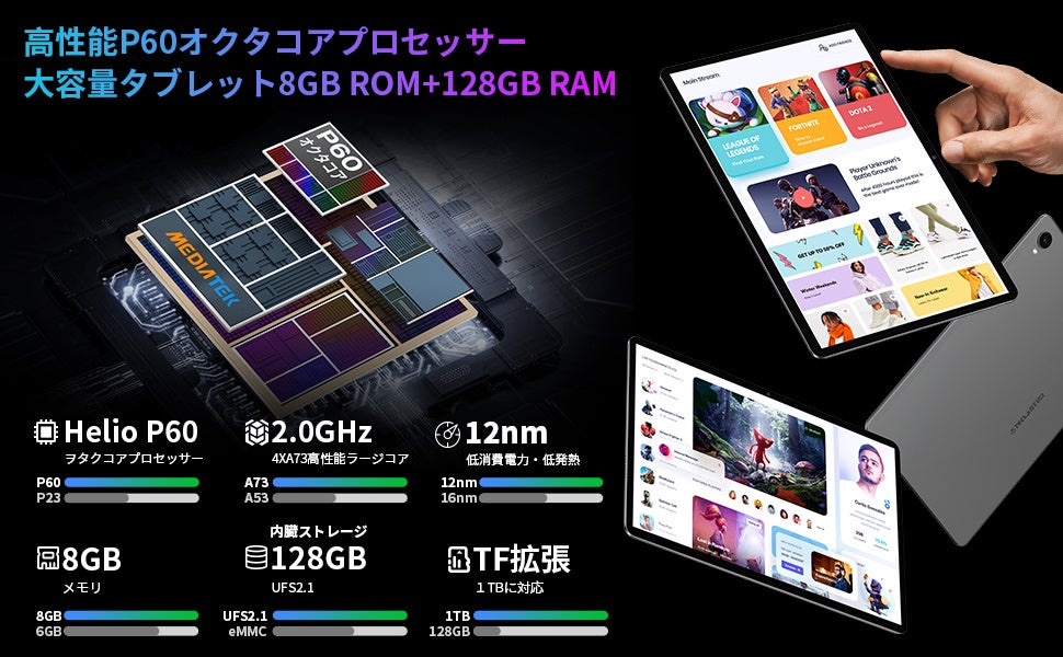 最大8GBのランニングメモリを増設し、マルチタスクアプリの高速な切り替えを実現します。128GBの高速UFS2.1ストレージにより、アプリケーションの起動やインストールを高速化します。最大1TBのMicroSDカードで拡張して、さらに多くのストレージを利用できます。