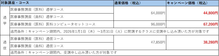 医療現場で幅広く求められる医療事務資格は、年齢や経験を問わず挑戦しやすい人気の資格です。医療機関で活躍したい方はもちろん、資格を取得して就職・転職を目指す方におすすめです。また、通学・通信とコースを選べるので、ライフスタイルに合わせて効率的に学習を進められます。今回のキャンペーンでは、通学コース30%OFF、通信コース20%OFFにてご提供します。