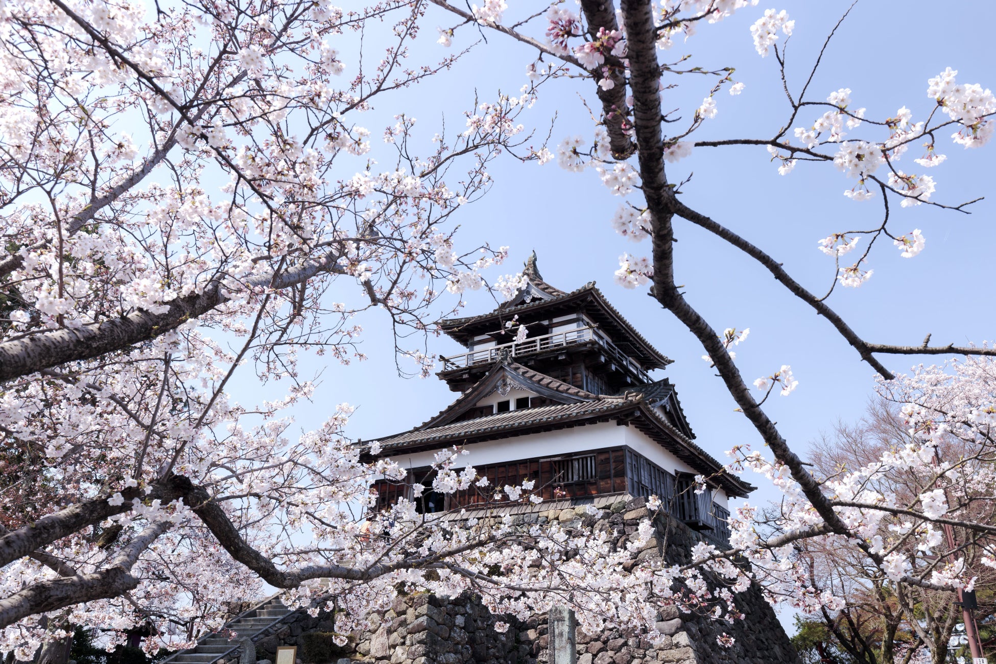 戦国時代の威風をとどめ、素朴で武骨な風貌から、「野武士」に例えられる丸岡城。織田信長による越前一向一揆平定後、「豊原」を与えられた柴田勝豊が創建したとされています。石瓦の屋根、急勾配の階段、二層三階の望楼型天守は、北陸で唯一の現存天守です。近年の調査結果、現在の天守は、寛永5年(1628)頃につくられたものであると判明しました。17人の城主のうち、本多家4代、有馬家8代の藩主により丸岡藩5万石を幕末まで維持しました。