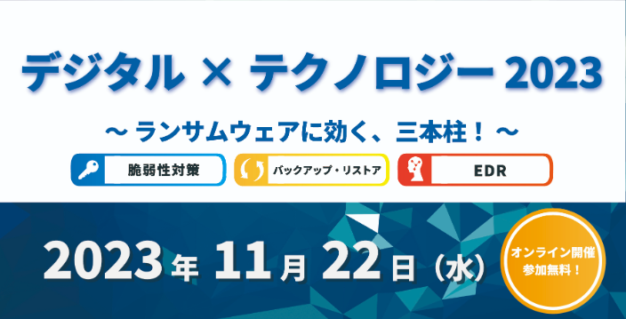 当イベントでは、「ランサムウエアに効く、三本柱」と題して、「バックアップ・リストア」「EDR」「脆弱性対策」に関する、各企業様による講演を行います。また、特設ページを通じて、デジタルテクノロジーが提供するランサムウエア対策ソリューションをお届けします。