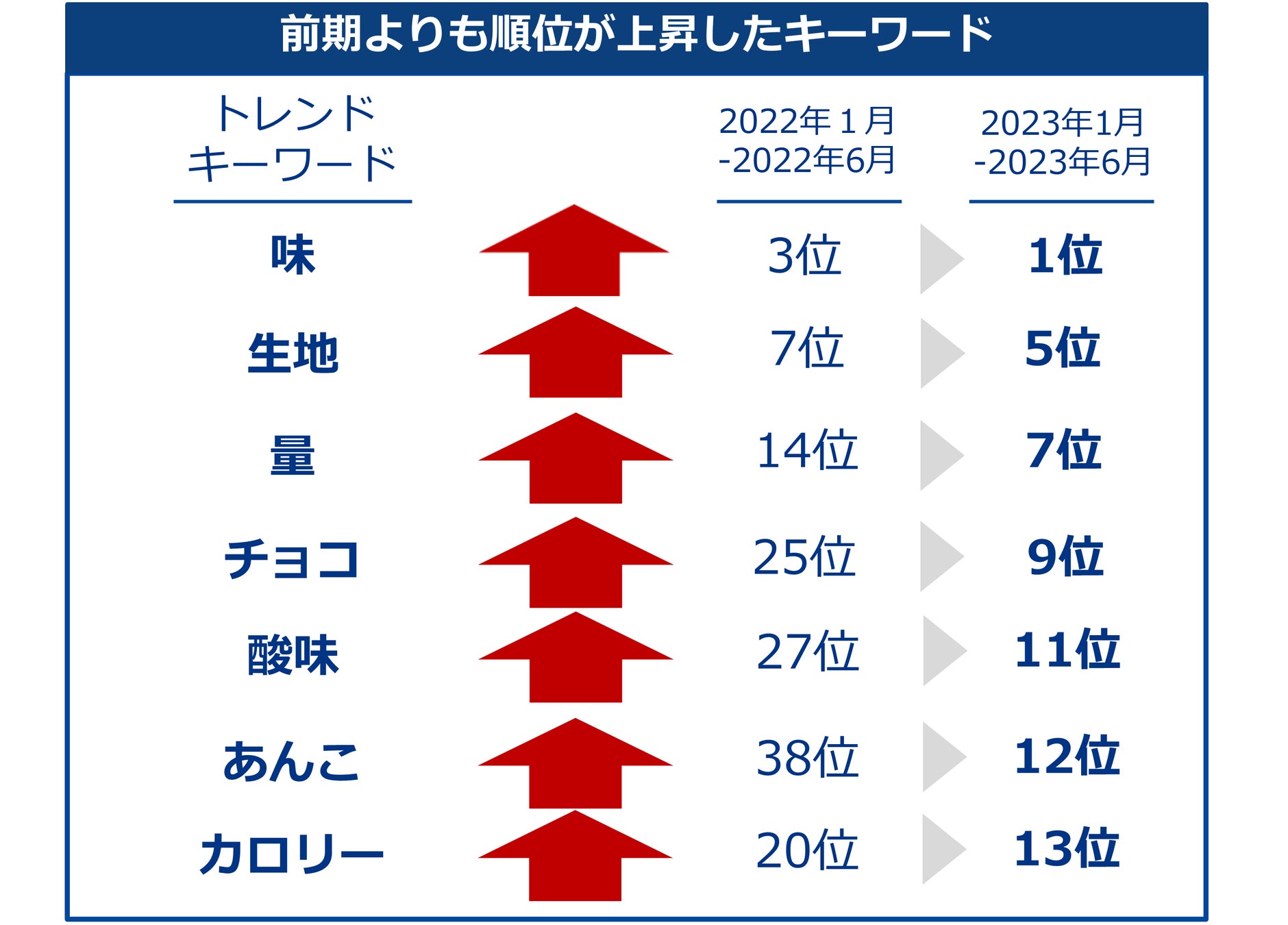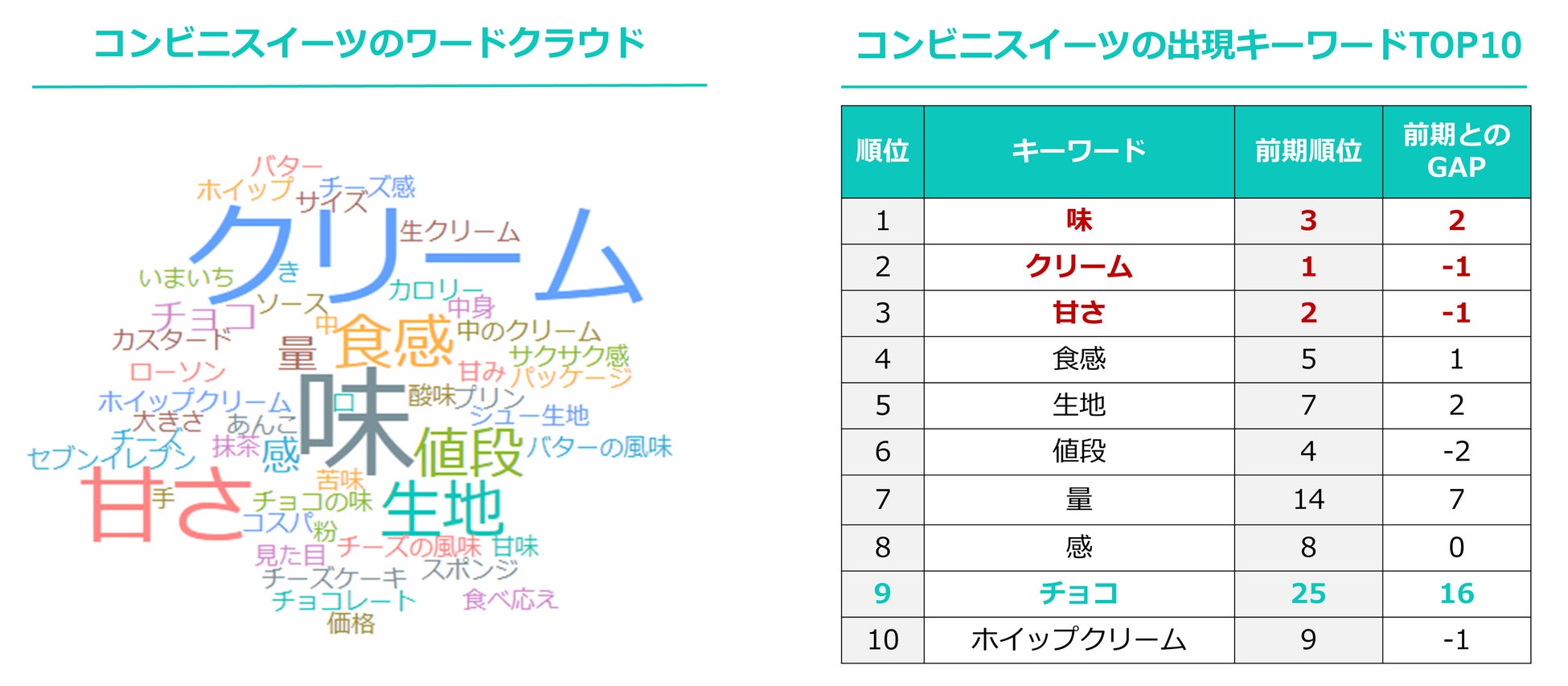 出現キーワードのランキングをみると、1位 味・2位 クリーム・3位 甘さ と続いており前期3位だった 味 が1位に順位を上げている。その他のTOP10のキーワードでは、チョコが前期より大きく順位を上げている。