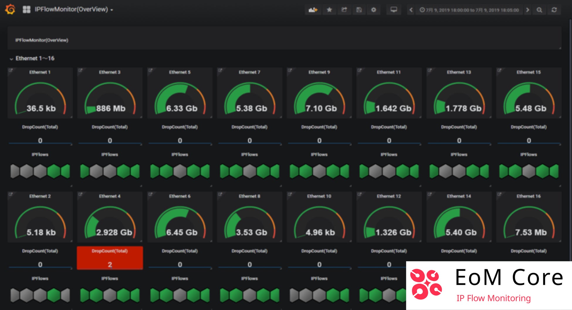 「EoM Core」は映像や音声といった配信データに関する通信を監視します。さらに、PTP(高精度時刻同期規格)やIGMP(マルチキャスト通信規格)といった制御関連の通信まで監視するため、映像伝送に問題が生じた場合に、原因を詳細に追求することが可能となります。国内の大手放送関連企業と海外の公共放送局を中心に導入されています。