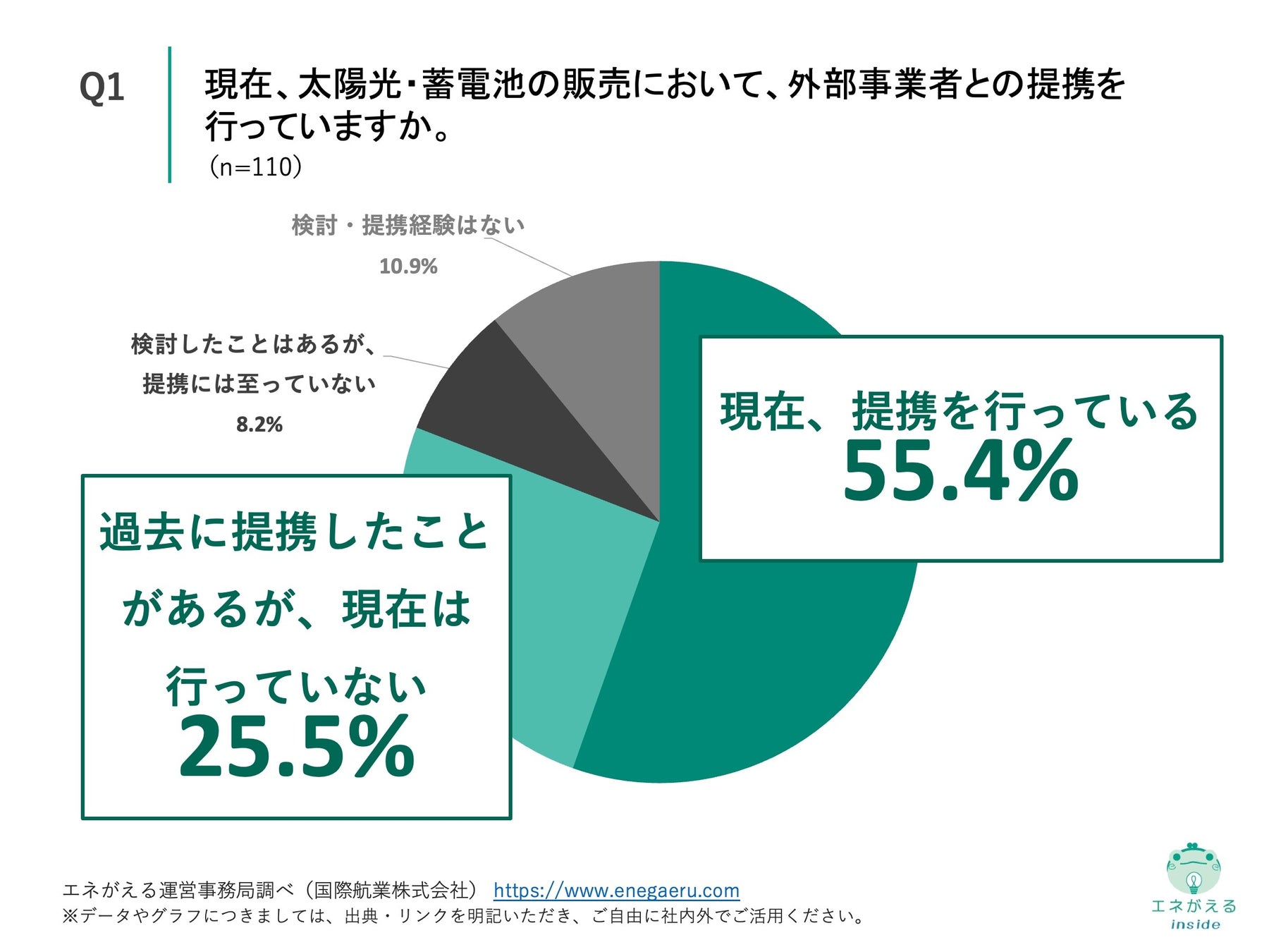 「Q1.現在、太陽光・蓄電池の販売において、外部事業者との提携を行っていますか。」(n=110)と質問したところ、「現在、提携を行っている」が55.4%、「過去に提携したことがあるが、現在は行っていない」が25.5%という回答になりました。