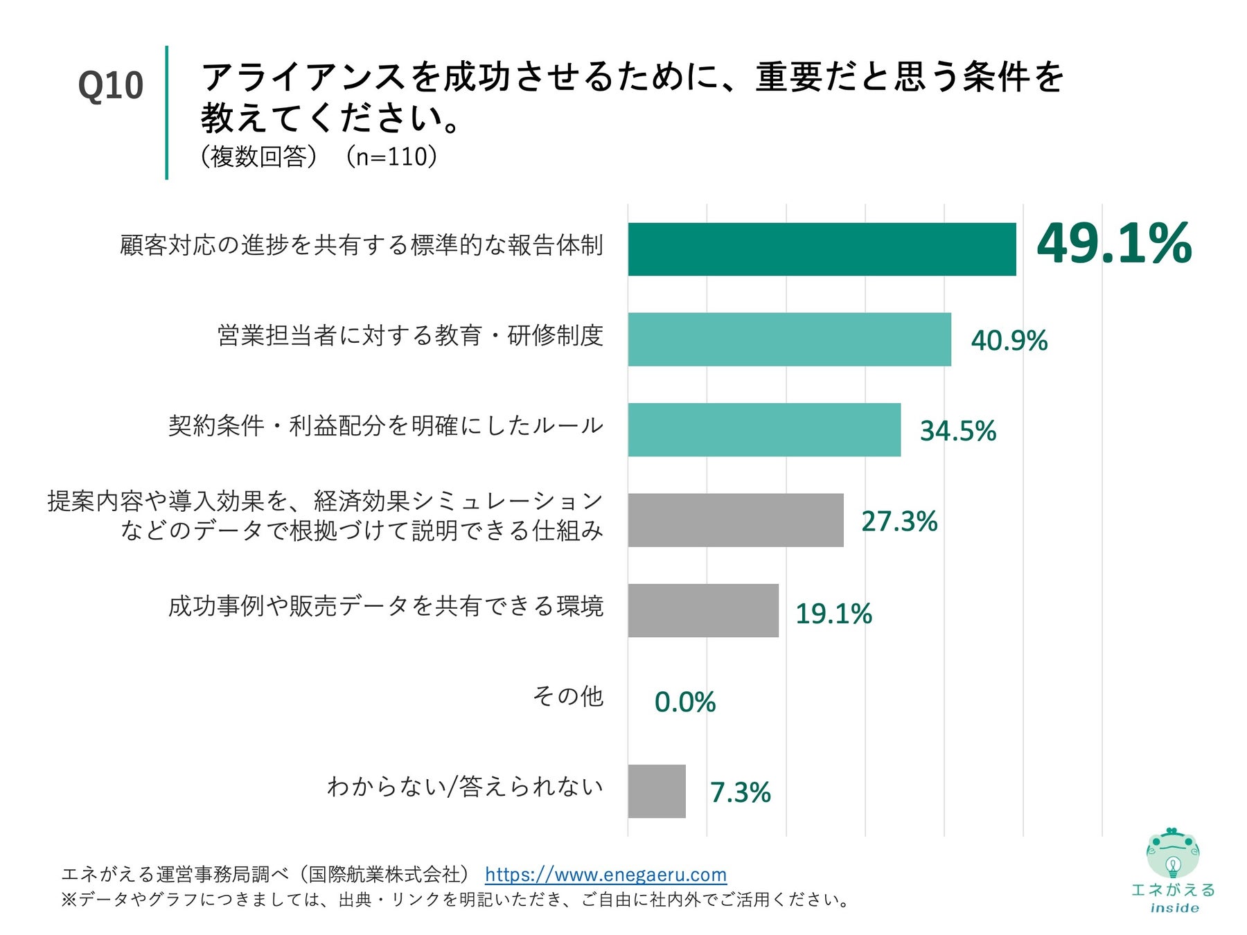 「Q10.アライアンスを成功させるために、重要だと思う条件を教えてください。(複数回答)」(n=110)と質問したところ、「顧客対応の進捗を共有する標準的な報告体制」が49.1%、「営業担当者に対する教育・研修制度」が40.9%、「契約条件・利益配分を明確にしたルール」が34.5%という回答になりました。