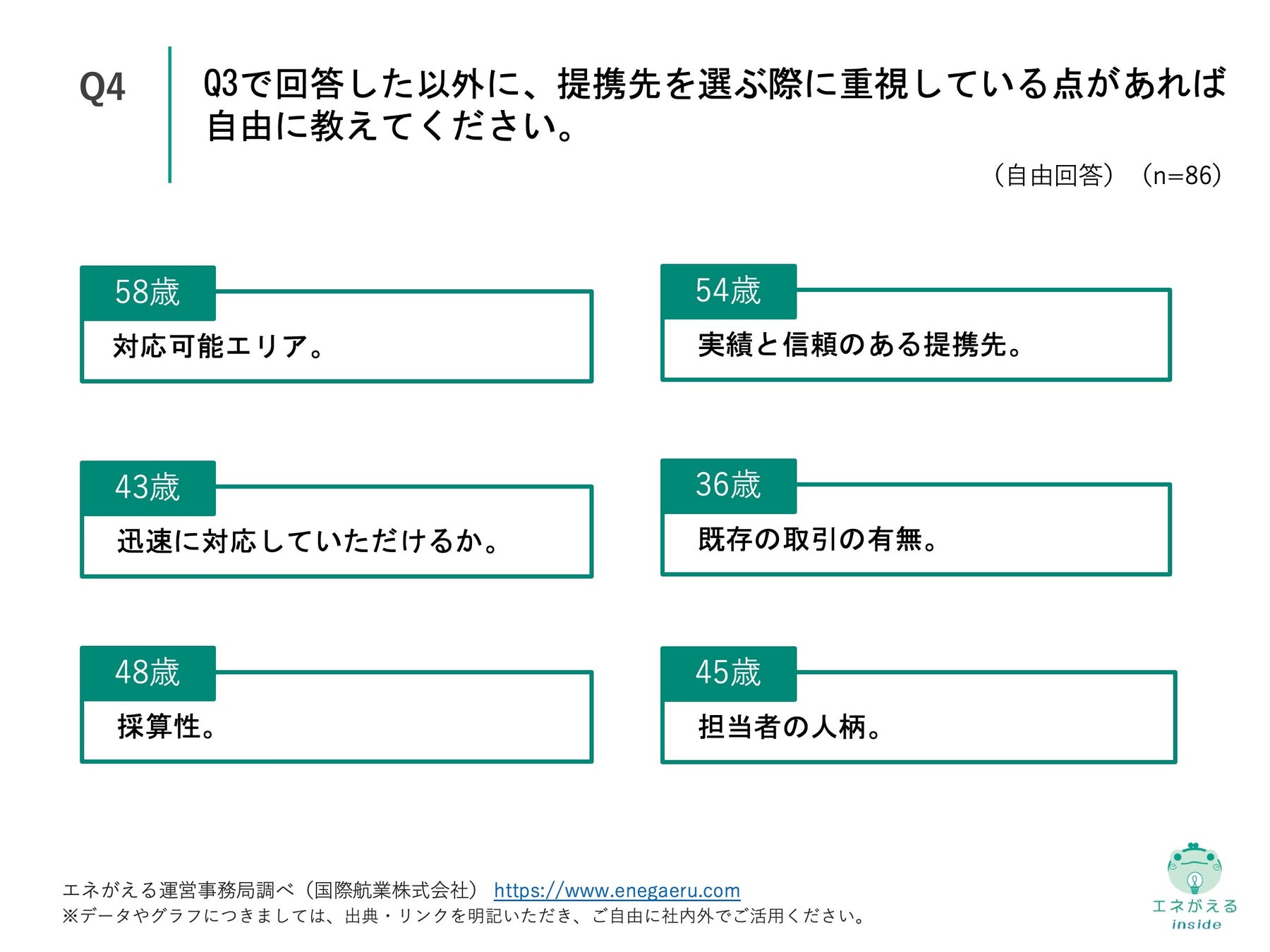 Q3で「その他」「わからない/答えられない」以外を選択した方に、「Q4.Q3で回答した以外に、提携先を選ぶ際に重視している点があれば自由に教えてください。」(n=86)と質問したところ、「対応可能エリア」や「実績と信頼のある提携先」など63の回答を得ることができました。