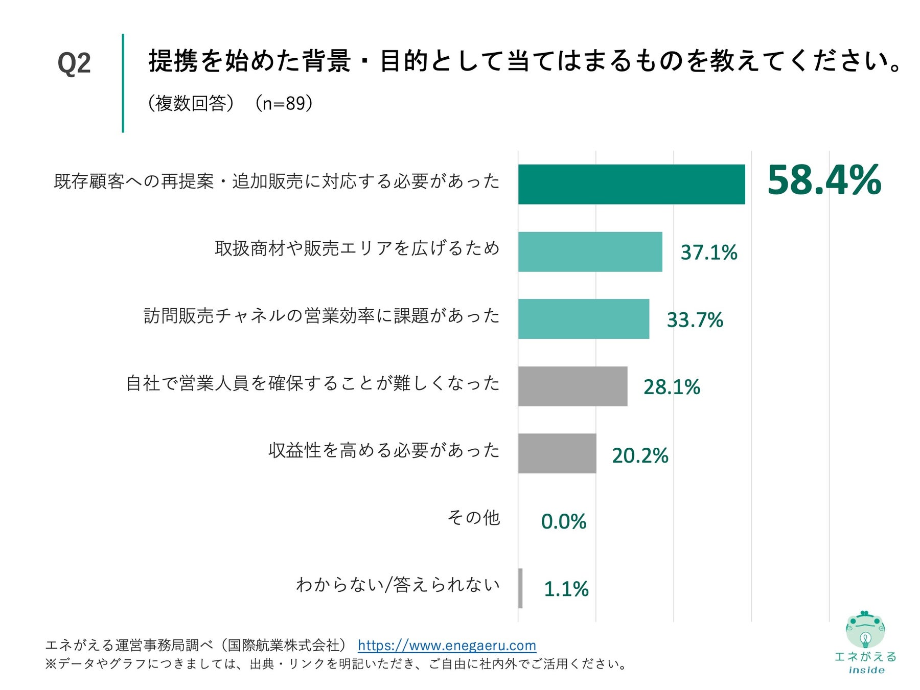 Q1で「現在、提携を行っている」「過去に提携したことがあるが、現在は行っていない」と回答した方に、「Q2.提携を始めた背景・目的として当てはまるものを教えてください。(複数回答)」(n=89)と質問したところ、「既存顧客への再提案・追加販売に対応する必要があった」が58.4%、「取扱商材や販売エリアを広げるため」が37.1%、「訪問販売チャネルの営業効率に課題があった」が33.7%という回答になりました。