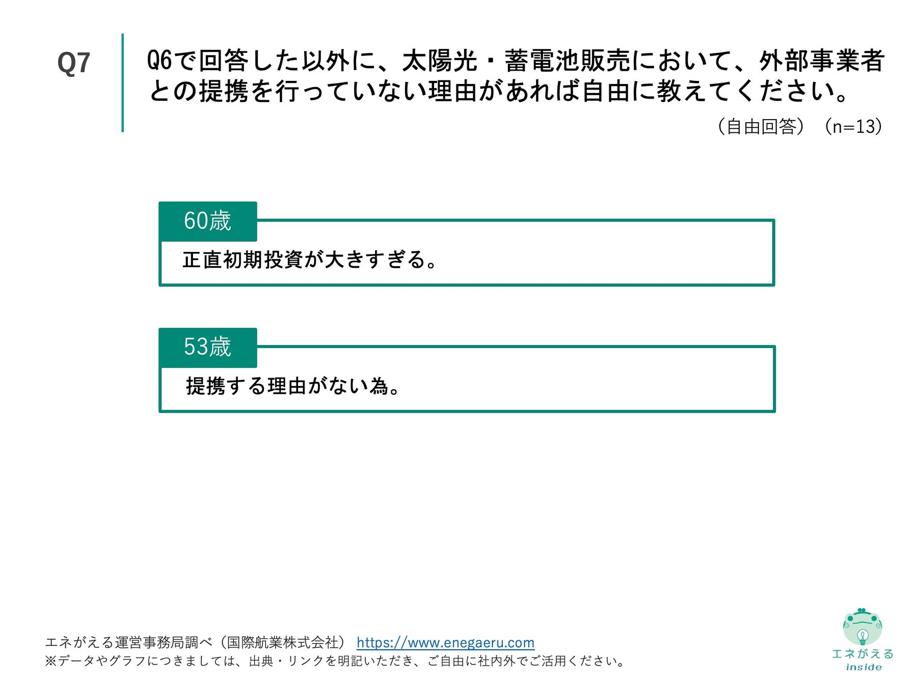Q6で「その他」「わからない/答えられない」以外を選択した方に、「Q7.Q6で回答した以外に、太陽光・蓄電池販売において、外部事業者との提携を行っていない理由があれば自由に教えてください。」(n=13)と質問したところ、「正直初期投資が大きすぎる」や「提携する理由がない為」など7の回答を得ることができました。