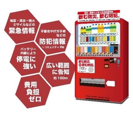 この自動販売機は地域のFM局が発信する災害情報などを音声で伝えることができる自動起動ラジオを搭載しています。自動販売機に取り付けた自動起動ラジオは全天候型の防水防錆となっており、地域のFM局が緊急で情報を放送する際、自動的に電源が入り、スピーカーから放送が流れます。街中にある自動販売機から防災・防犯情報を拡声することで、外出中の市民にもいち早く緊急情報を伝えることができます。この事業は、コカ・コーラ ボトラーズジャパン株式会社、FVジャパン株式会社の協力のもと、防災機能付自動販売機の設置・普及を推進しております。